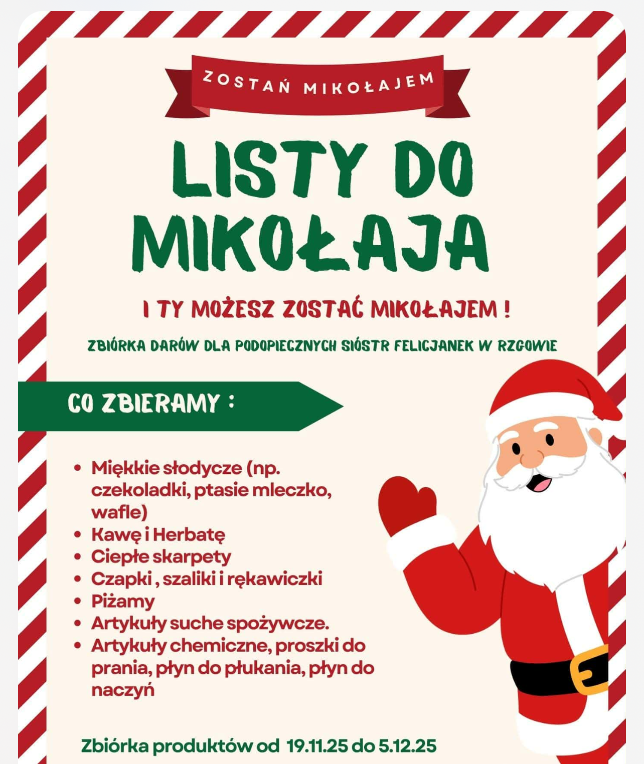 Nasza szkoła włączyła się w zbiórkę darów dla podopiecznych Sióstr Felicjanek w Rzgowie. Jej celem jest pomoc osobom starszym i schorowanym, które samotnie spędzają święta. Zbiórka jest dobrowolna, każdy kto zechciałby wesprzeć akcję organizowaną przez Siostry Zakonne i Panią Paulinę Nowak, może przynieść wybrane produkty z listy do szkoły. Akcja trwa do 5 grudnia.