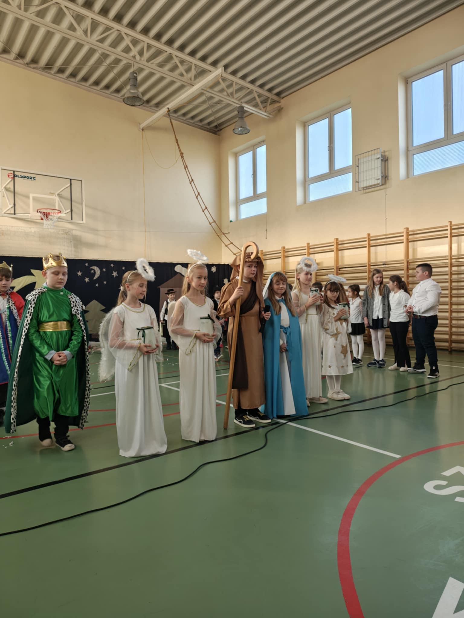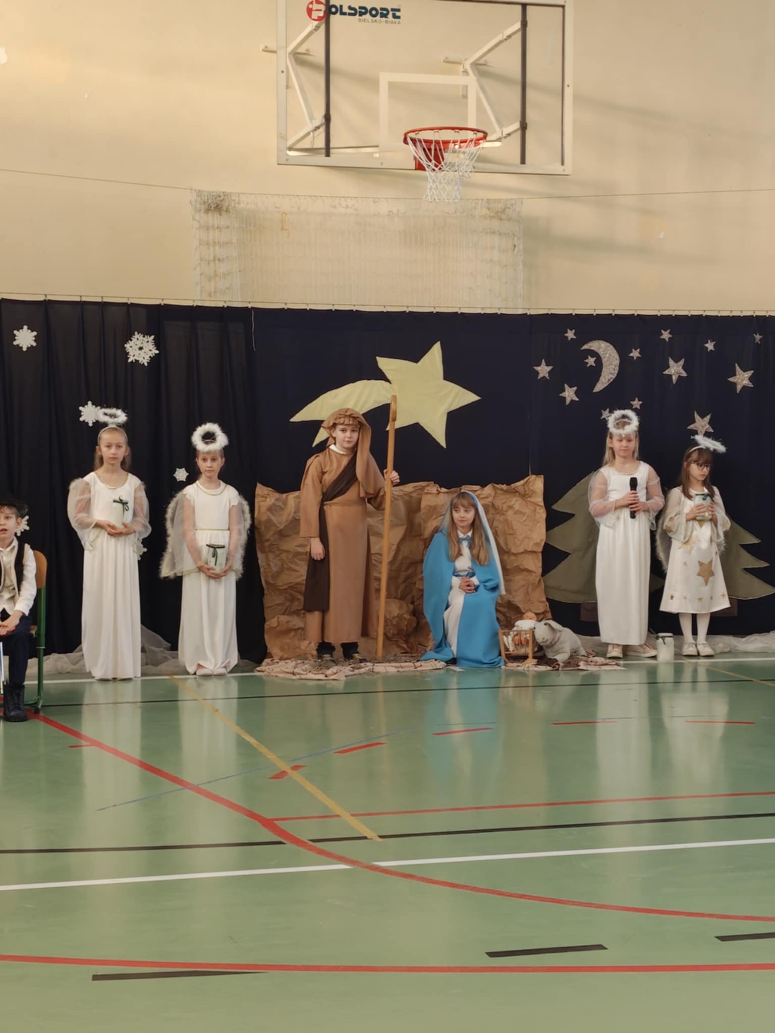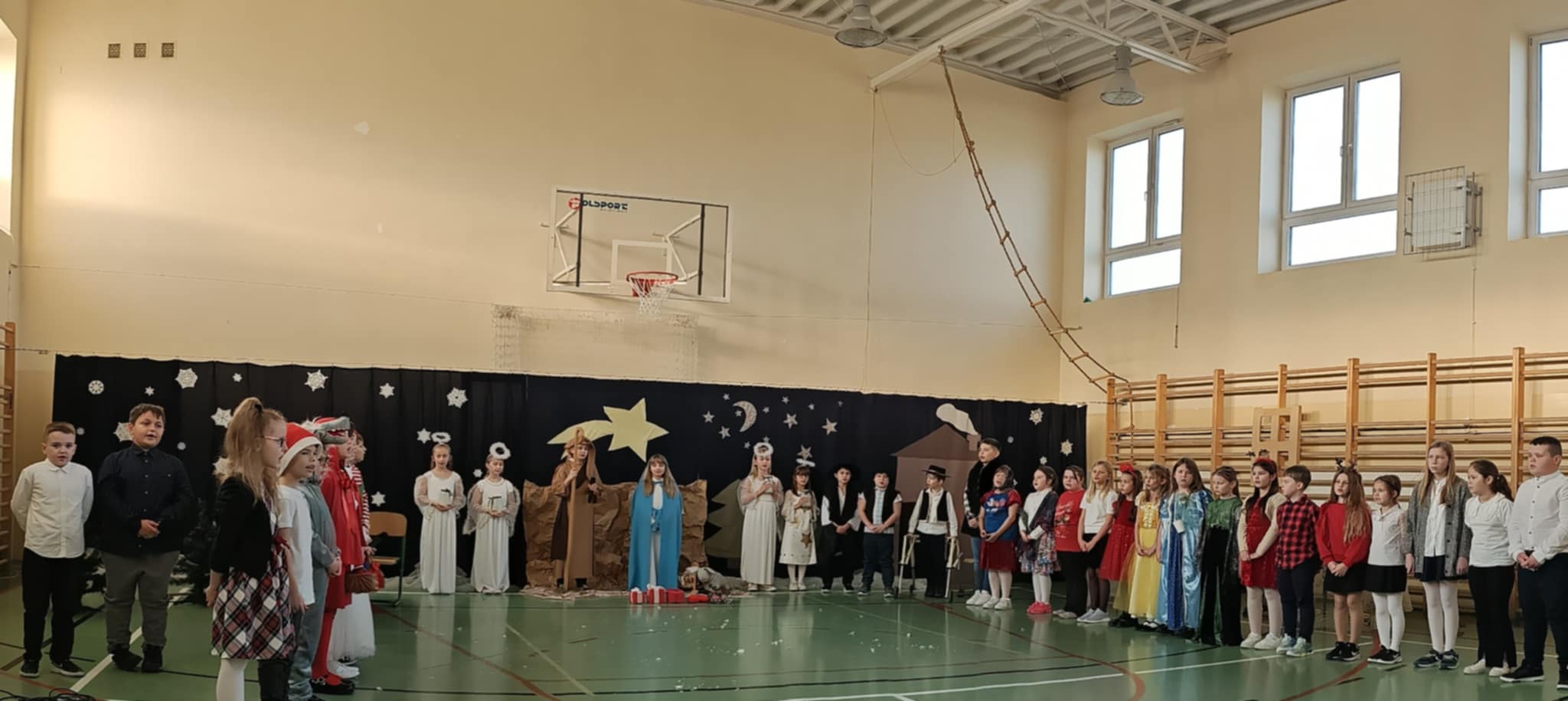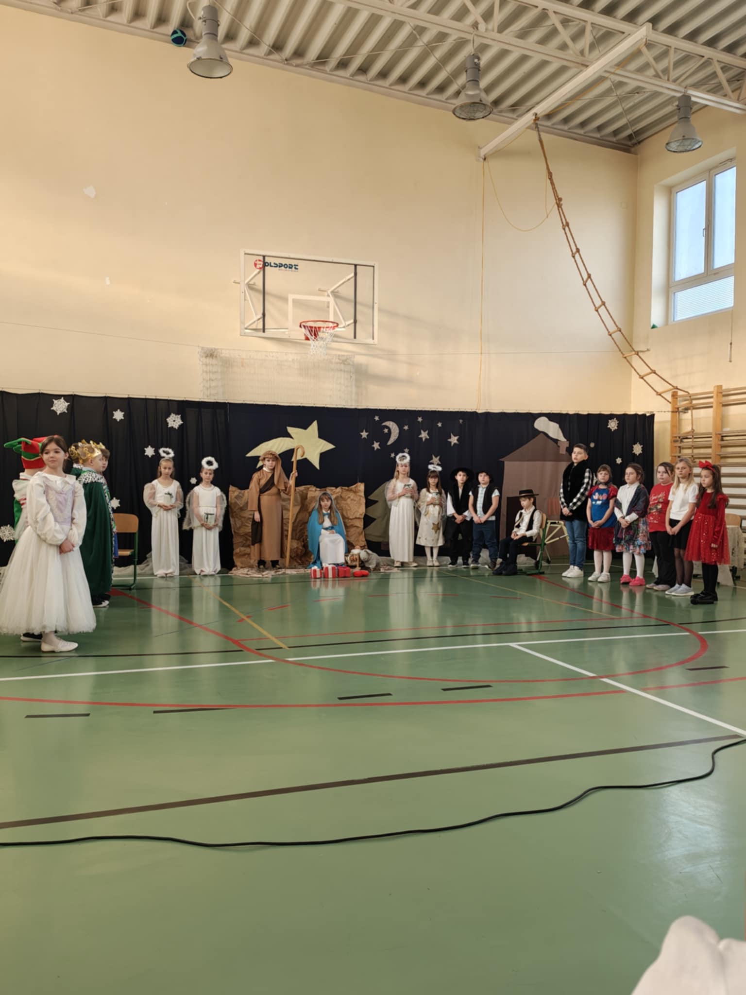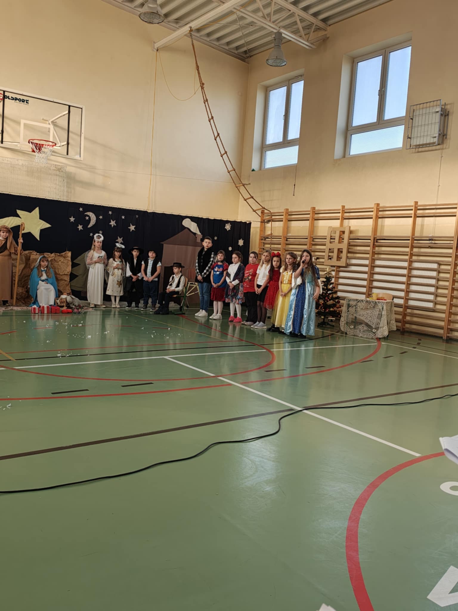 Przedstawienie jasełkowe przygotowane przez uczniów klas drugiej i trzeciej wprowadziło wszystkich w wyjątkowy, świąteczny nastrój. Jasełka miały klasyczny charakter – w centrum wydarzeń znalazła się stajenka betlejemska z Maryją, Józefem i Dzieciątkiem Jezus. Wyjątkowym elementem widowiska były jednak odwiedziny nietypowych gości – do stajenki przybyły również postacie znane z bajek, co dodało całemu przedstawieniu oryginalności i radosnego charakteru. Całość uatrakcyjniła piękna oprawa muzyczna. Dzieci z wielkim zaangażowaniem śpiewały kolędy, które poruszyły serca publiczności. Uczniowie klasy szóstej grali na flażoletach, a uczniowie klasy siódmej na cymbałkach tworząc wyjątkowy świąteczny akompaniament dziewczynce z klasy piątej, która śpiewała kolędę. Szczególne wzruszenie wzbudził występ uczennicy klasy drugiej, która zagrała na skrzypcach. Przedstawienie było dowodem na to, że wspólna praca uczniów z różnych klas może zaowocować pięknym i wzruszającym wydarzeniem, które na długo pozostanie w pamięci widzów.