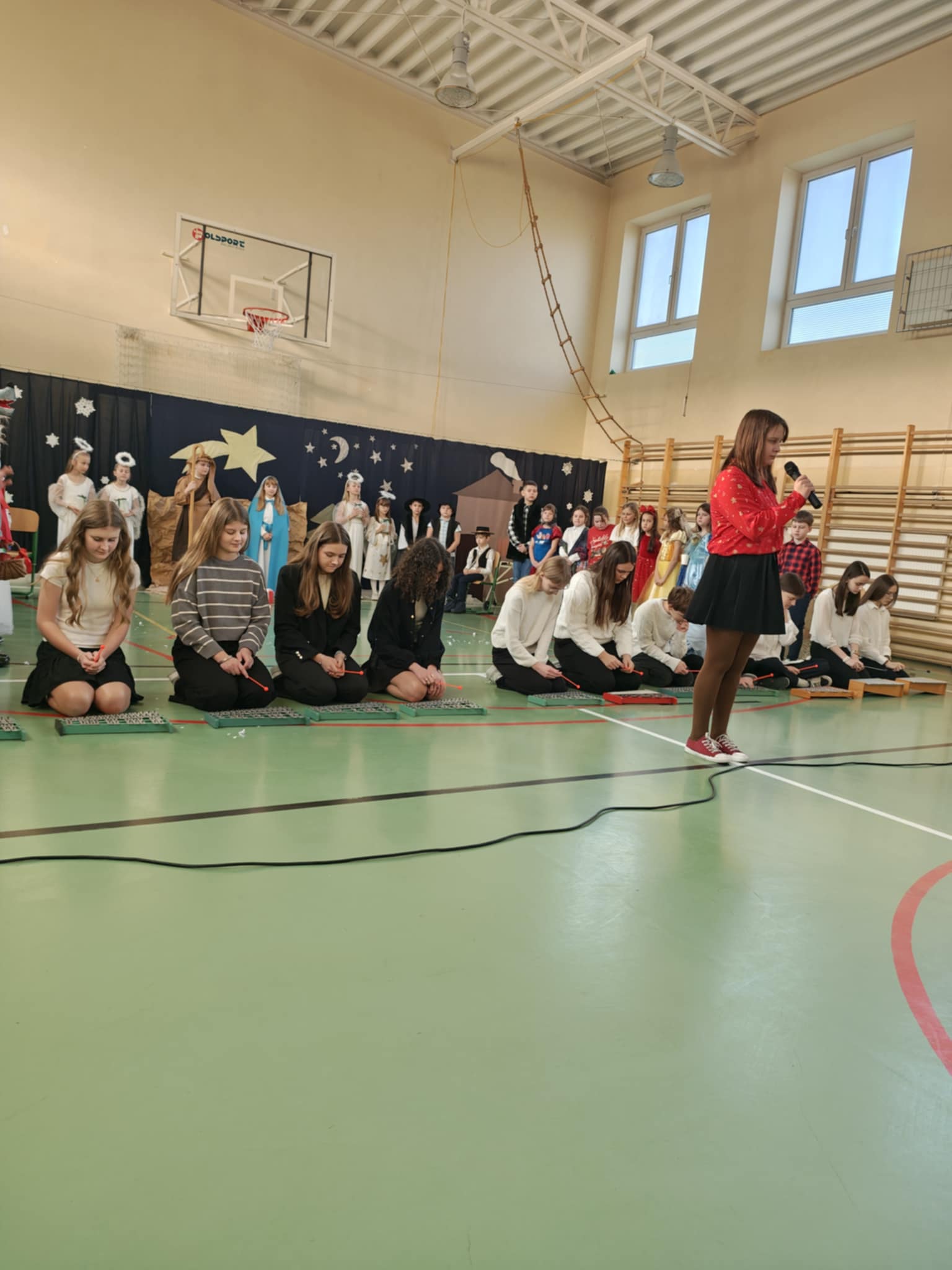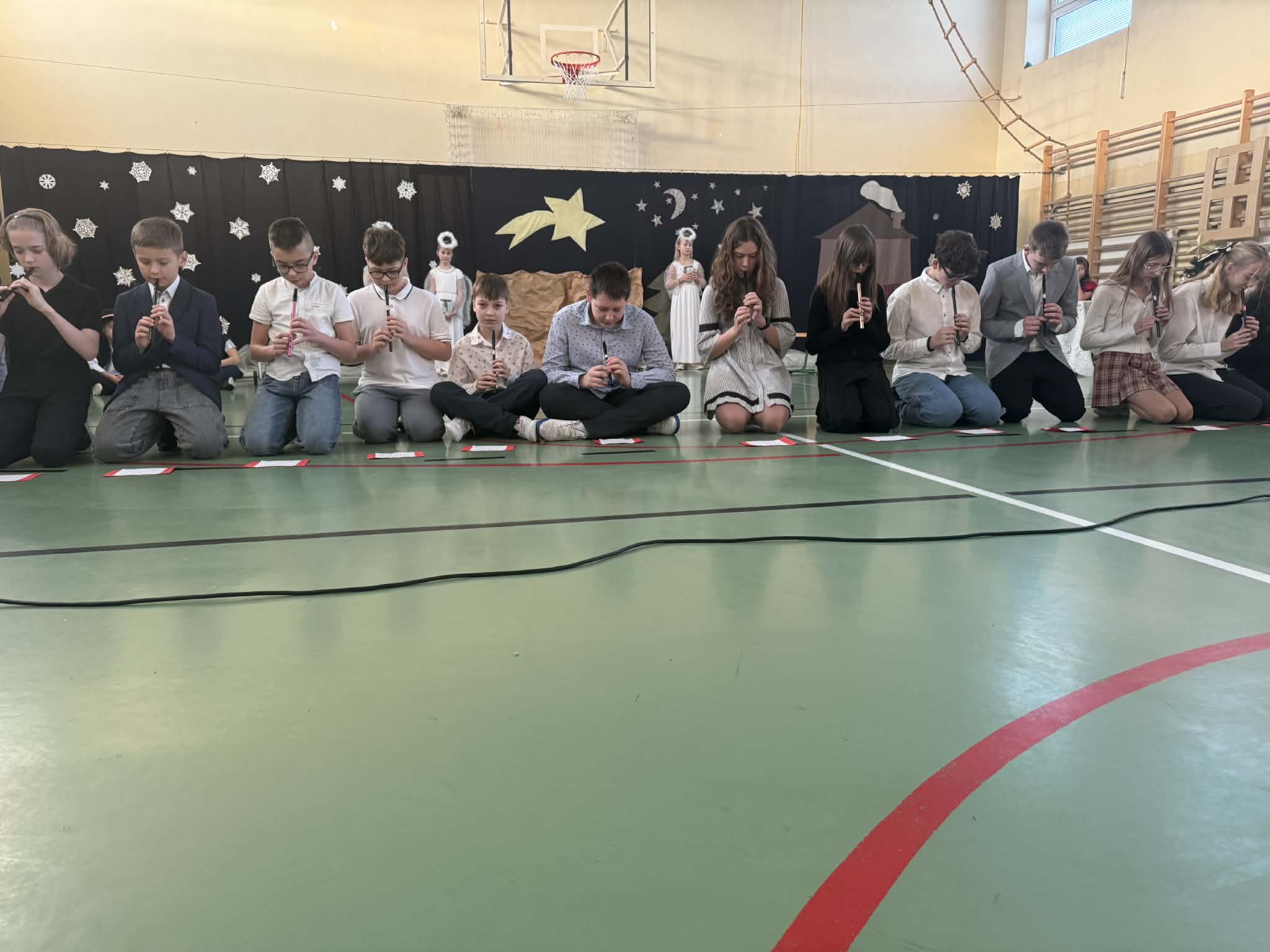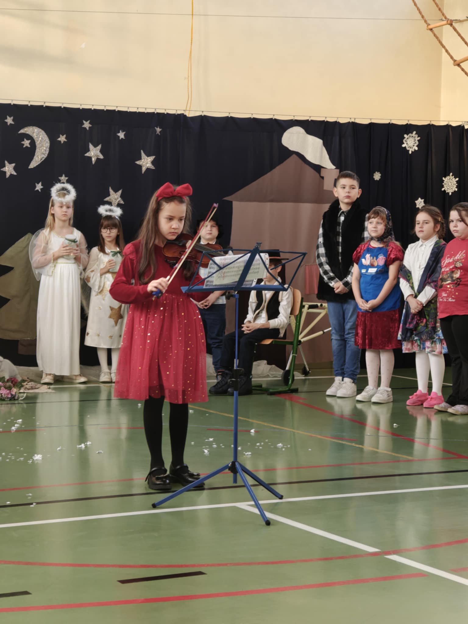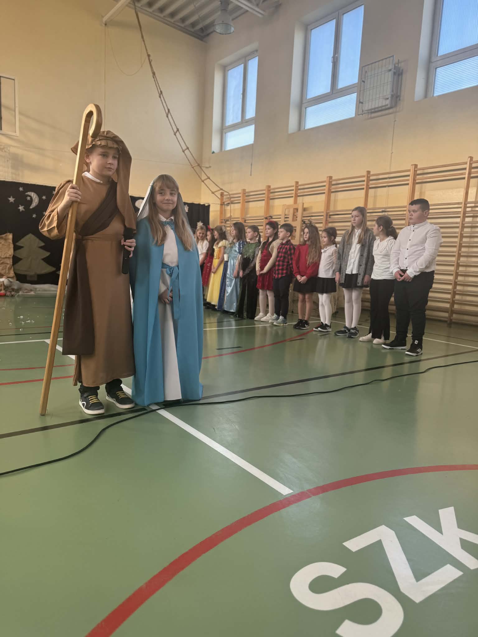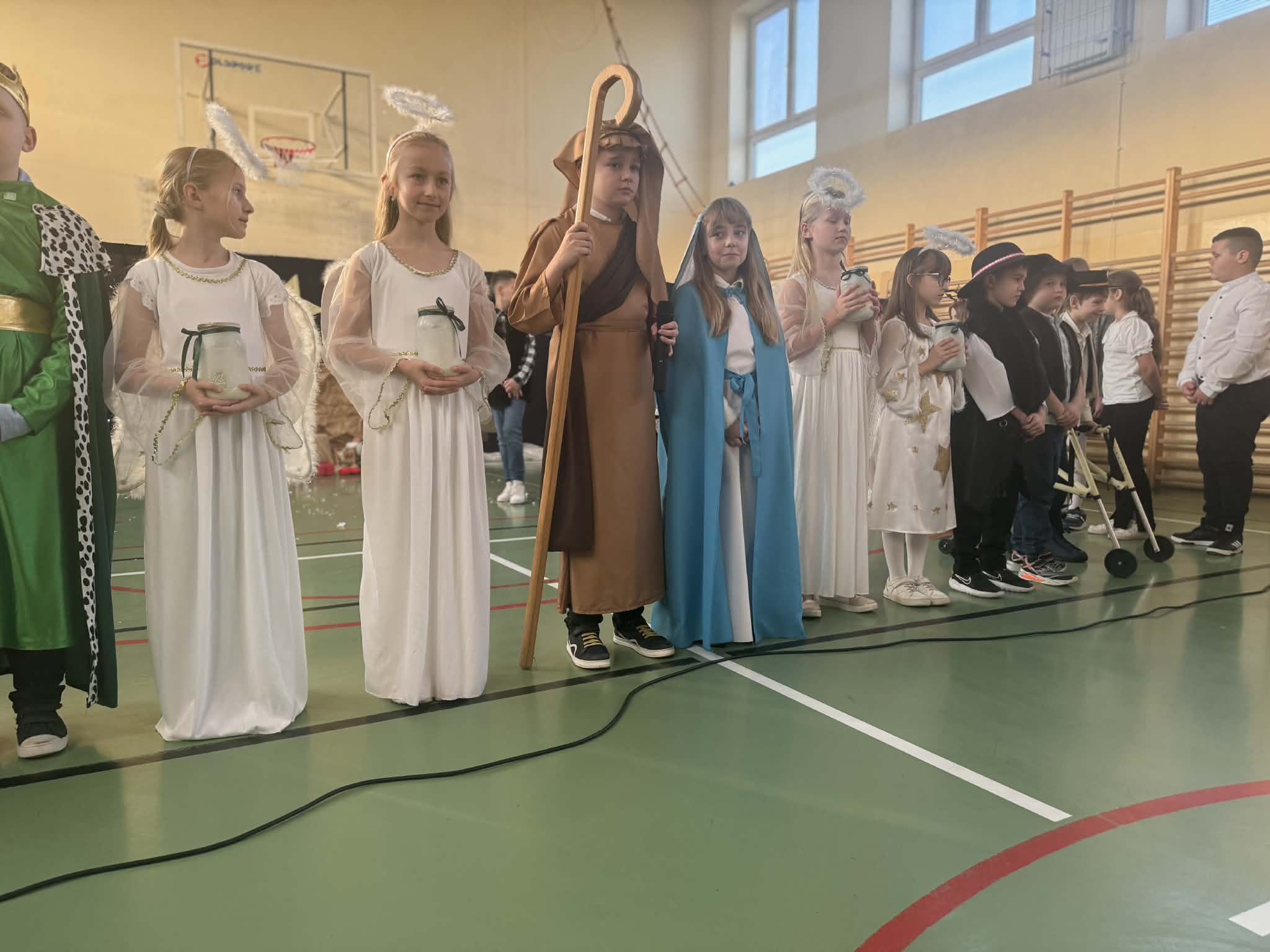 Przedstawienie jasełkowe przygotowane przez uczniów klas drugiej i trzeciej wprowadziło wszystkich w wyjątkowy, świąteczny nastrój. Jasełka miały klasyczny charakter – w centrum wydarzeń znalazła się stajenka betlejemska z Maryją, Józefem i Dzieciątkiem Jezus. Wyjątkowym elementem widowiska były jednak odwiedziny nietypowych gości – do stajenki przybyły również postacie znane z bajek, co dodało całemu przedstawieniu oryginalności i radosnego charakteru. Całość uatrakcyjniła piękna oprawa muzyczna. Dzieci z wielkim zaangażowaniem śpiewały kolędy, które poruszyły serca publiczności. Uczniowie klasy szóstej grali na flażoletach, a uczniowie klasy siódmej na cymbałkach tworząc wyjątkowy świąteczny akompaniament dziewczynce z klasy piątej, która śpiewała kolędę. Szczególne wzruszenie wzbudził występ uczennicy klasy drugiej, która zagrała na skrzypcach. Przedstawienie było dowodem na to, że wspólna praca uczniów z różnych klas może zaowocować pięknym i wzruszającym wydarzeniem, które na długo pozostanie w pamięci widzów.
