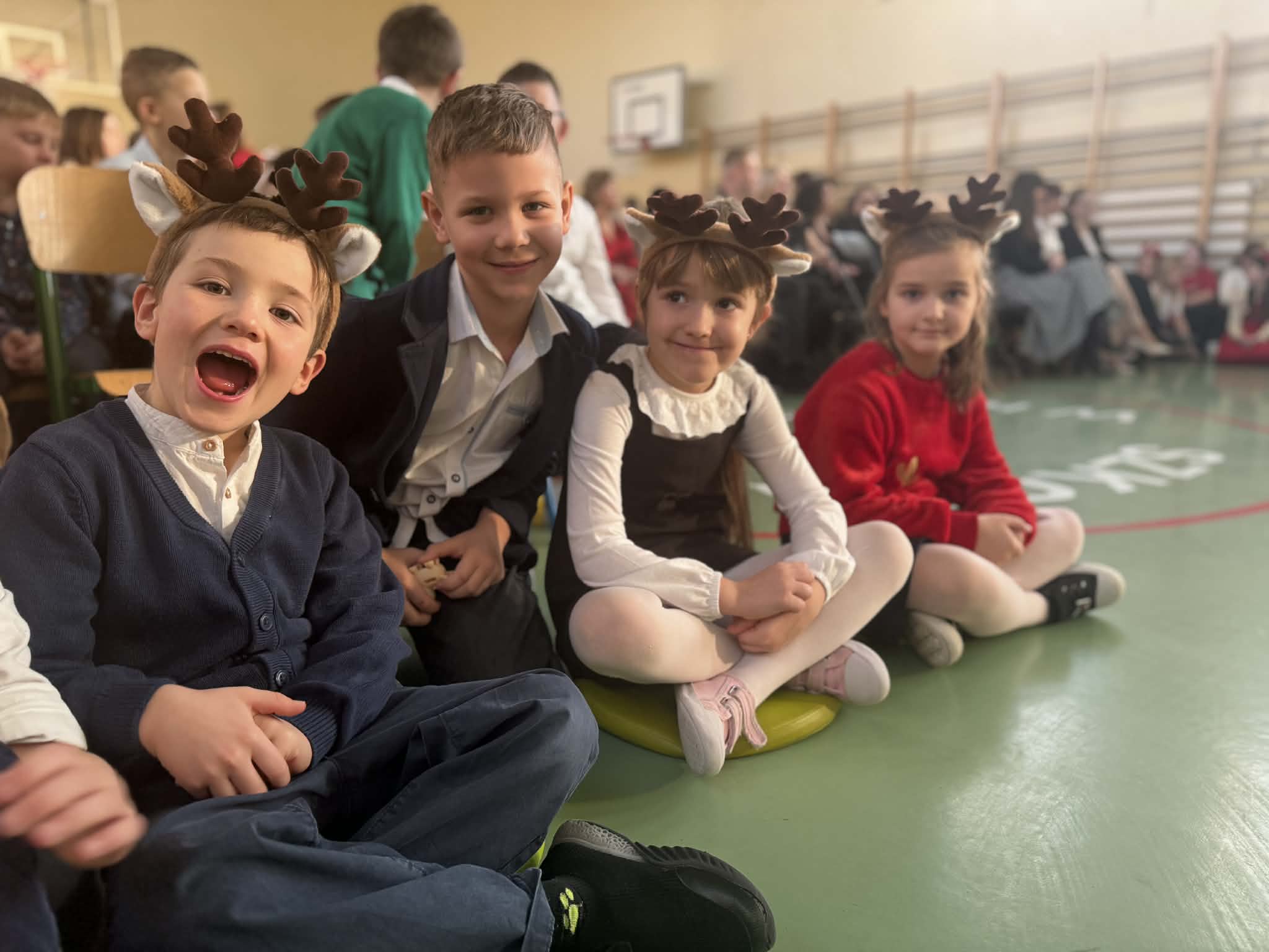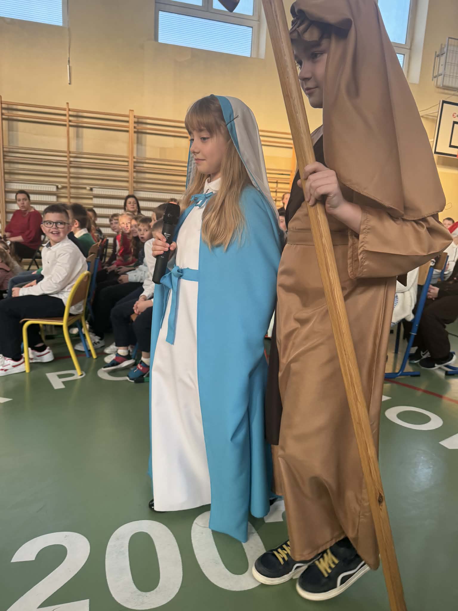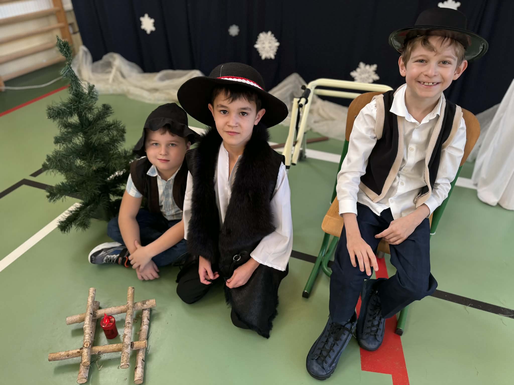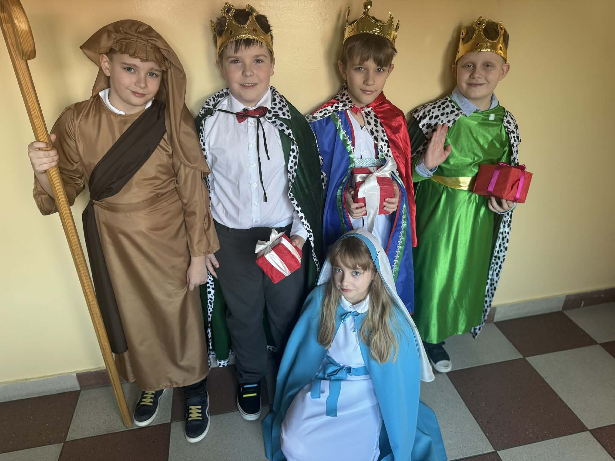 Przedstawienie jasełkowe przygotowane przez uczniów klas drugiej i trzeciej wprowadziło wszystkich w wyjątkowy, świąteczny nastrój. Jasełka miały klasyczny charakter – w centrum wydarzeń znalazła się stajenka betlejemska z Maryją, Józefem i Dzieciątkiem Jezus. Wyjątkowym elementem widowiska były jednak odwiedziny nietypowych gości – do stajenki przybyły również postacie znane z bajek, co dodało całemu przedstawieniu oryginalności i radosnego charakteru. Całość uatrakcyjniła piękna oprawa muzyczna. Dzieci z wielkim zaangażowaniem śpiewały kolędy, które poruszyły serca publiczności. Uczniowie klasy szóstej grali na flażoletach, a uczniowie klasy siódmej na cymbałkach tworząc wyjątkowy świąteczny akompaniament dziewczynce z klasy piątej, która śpiewała kolędę. Szczególne wzruszenie wzbudził występ uczennicy klasy drugiej, która zagrała na skrzypcach. Przedstawienie było dowodem na to, że wspólna praca uczniów z różnych klas może zaowocować pięknym i wzruszającym wydarzeniem, które na długo pozostanie w pamięci widzów.