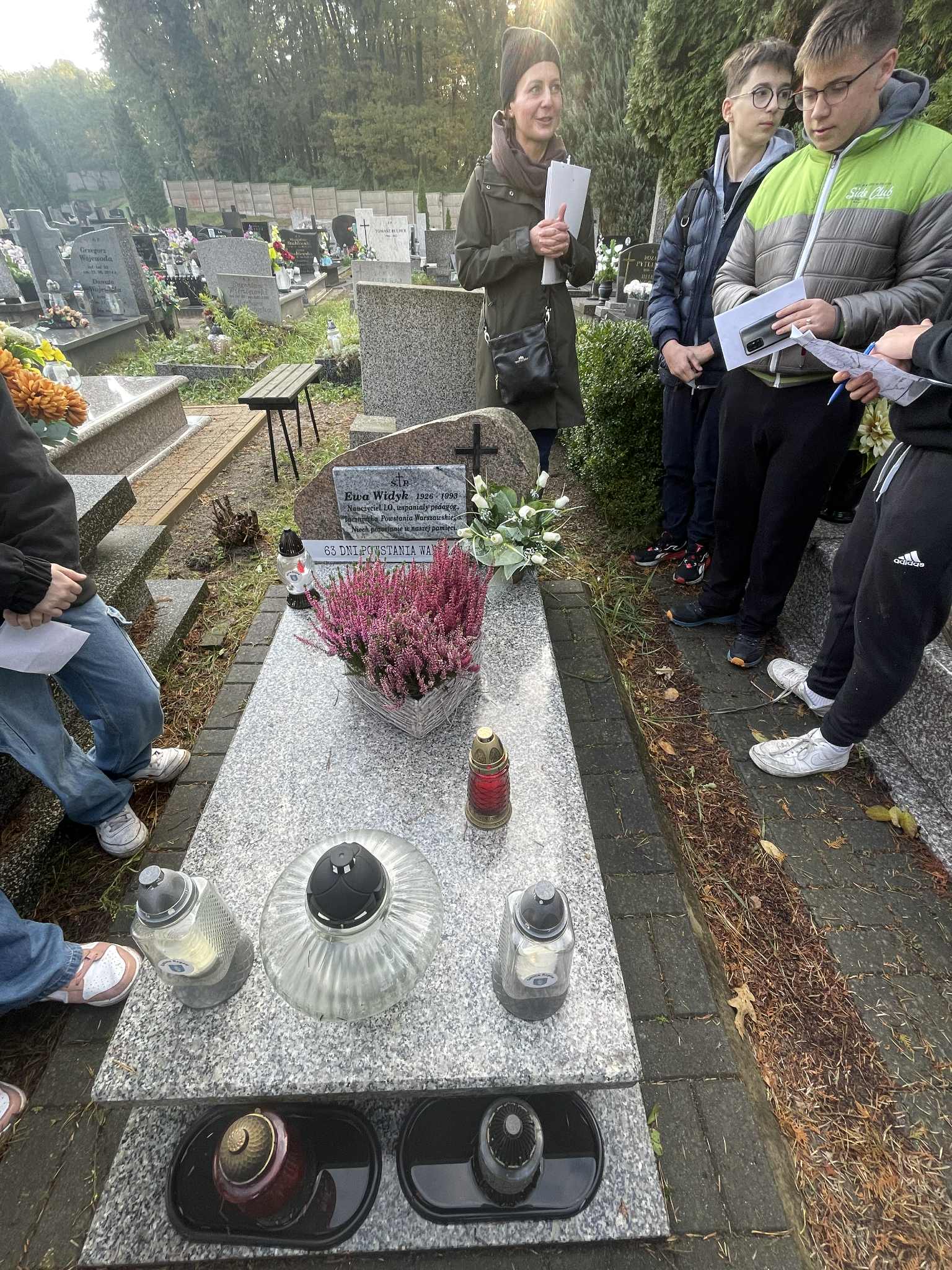 Uczniowie klasy 7 i 8 wzięli udział w krótkiej wycieczce po historycznych zakątkach naszego regionu. W drodze, niczym detektywi uzupełniali karty pracy, by rozwikłać tajemnice jakie kryje lokalna historia. Spacer rozpoczęli od Cmentarza Wojennego na Gadce Starej. To miejsce związane jest z Bitwą Łódzką, jedną z trzech największych bitew na froncie wschodnim. Na cmentarzu spoczywają polegli żołnierze I wojny św. W walkach w okolicy Rzgowskiej Góry brało udział ok. 800 tys. żołnierzy. Znajdują się tam mogiły nie tylko Niemców i Rosjan. Na polu bitwy zginęli również Polacy (przymusowo wcieleni do armii), Litwini, Austriacy, Ukraińcy, Tatarzy i Łotysze. Słuchając opowieści o wydarzeniach, uczniowie udali się na znajdujący obok, cmentarz katolicki. Tam zapalili znicz na pomniku Ewy Widyk, uczestniczki Powstania Warszawskiego, łodzianki, nauczycielki języka angielskiego z IV LO. Ewa była łączniczką AK w oddziale por. „Szarego” na Śródmieściu. W wyniku upadku powstania trafiła do obozu jenieckiego. Po wyzwoleniu stalagu, wyjechała do Wielkiej Brytanii, gdzie pracowała dla Marynarki Wojennej w Ochotniczej Służbie Kobiet Polskich Sił Zbrojnych. Zdała maturę, nauczyła się biegle języka angielskiego i jeszcze w okresie stalinizmu, powróciła do ukochanego kraju. Ewa to jedna z tych wielkich bohaterek małej ojczyzny, która nigdy nie opowiedziała swojej historii, lecz całym swoim życiem służyła Polsce.