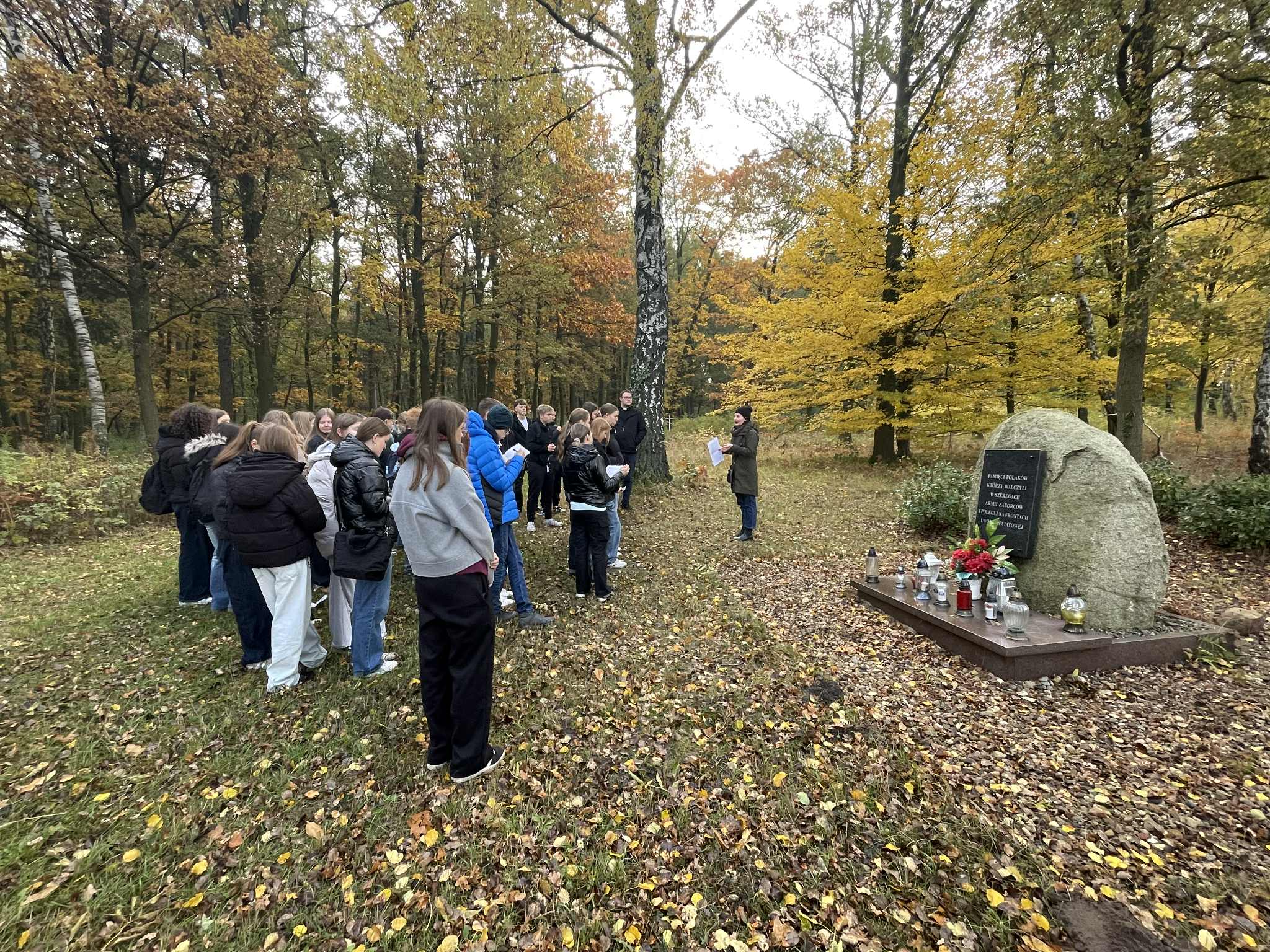 Ostatnim etapem wycieczki był przystanek przy Grobie Nieznanego Żołnierza w Rzgowie, symbolu bezimiennych bohaterów, którzy zginęli w czasie wojny obronnej Polski w 1939 r. Uczniowie oddali hołd poległym, zapalając znicz i skupiając się na modlitwie pod przewodnictwem ks. J. Hejduka. Spacer w blasku jesiennego słońca dodał nostalgii odkrywanym kartom lokalnej historii.