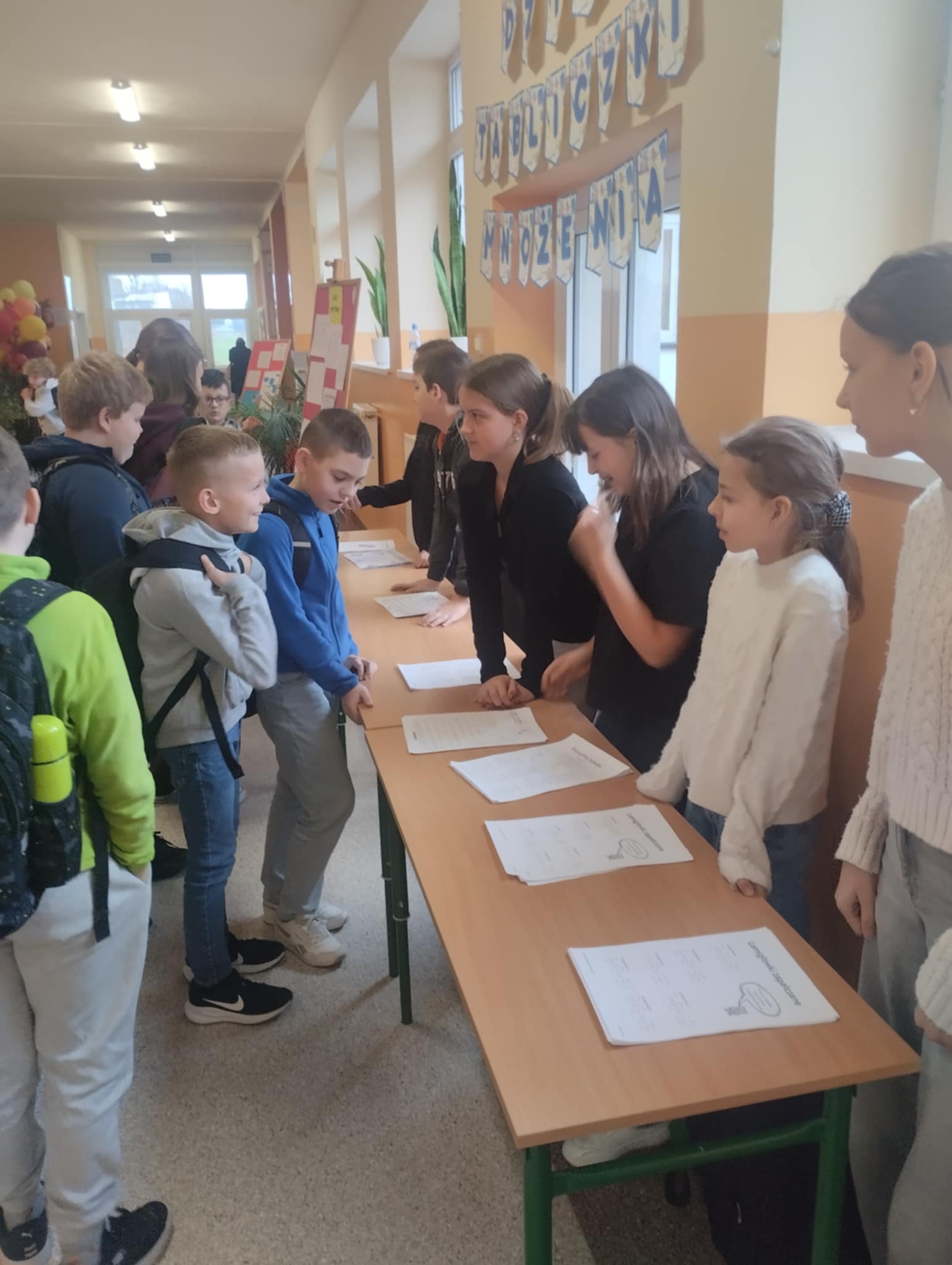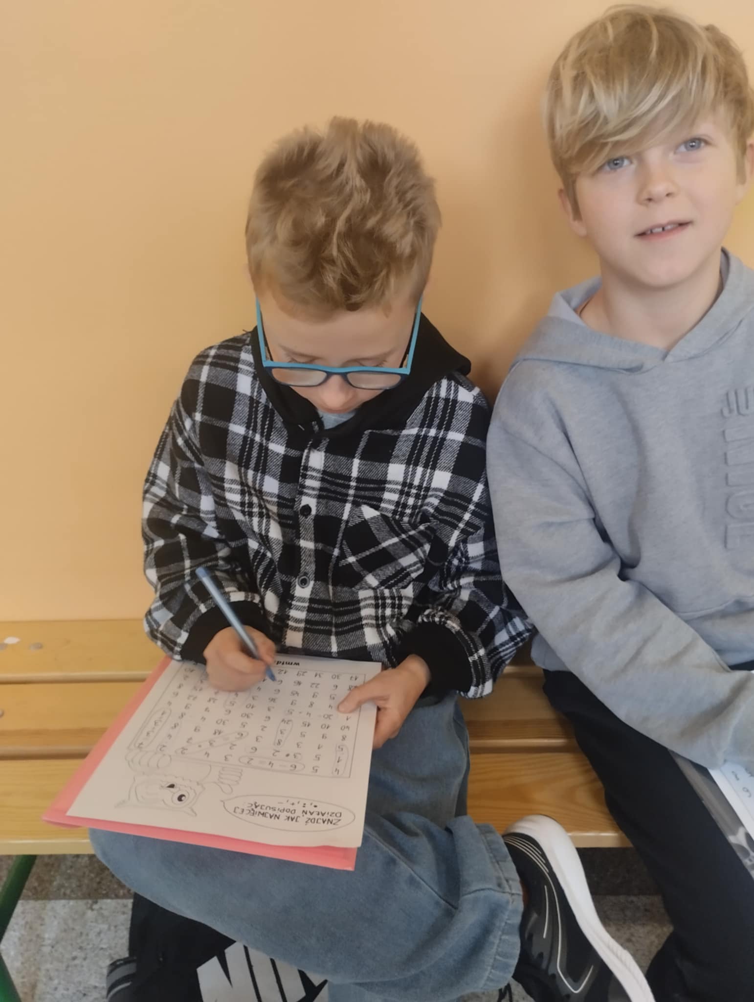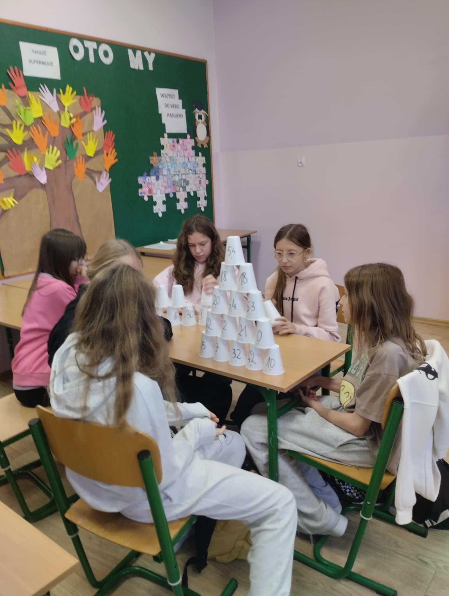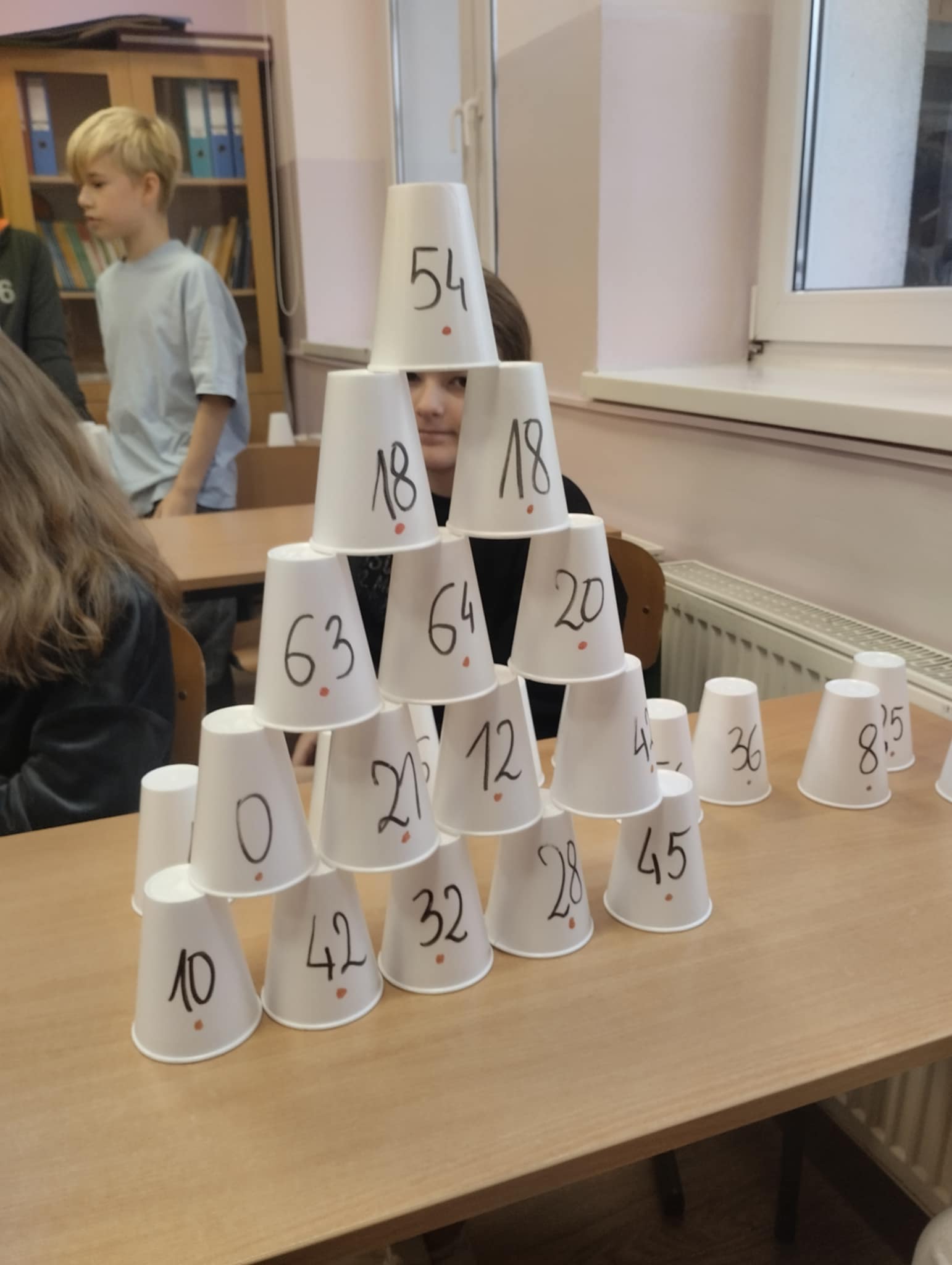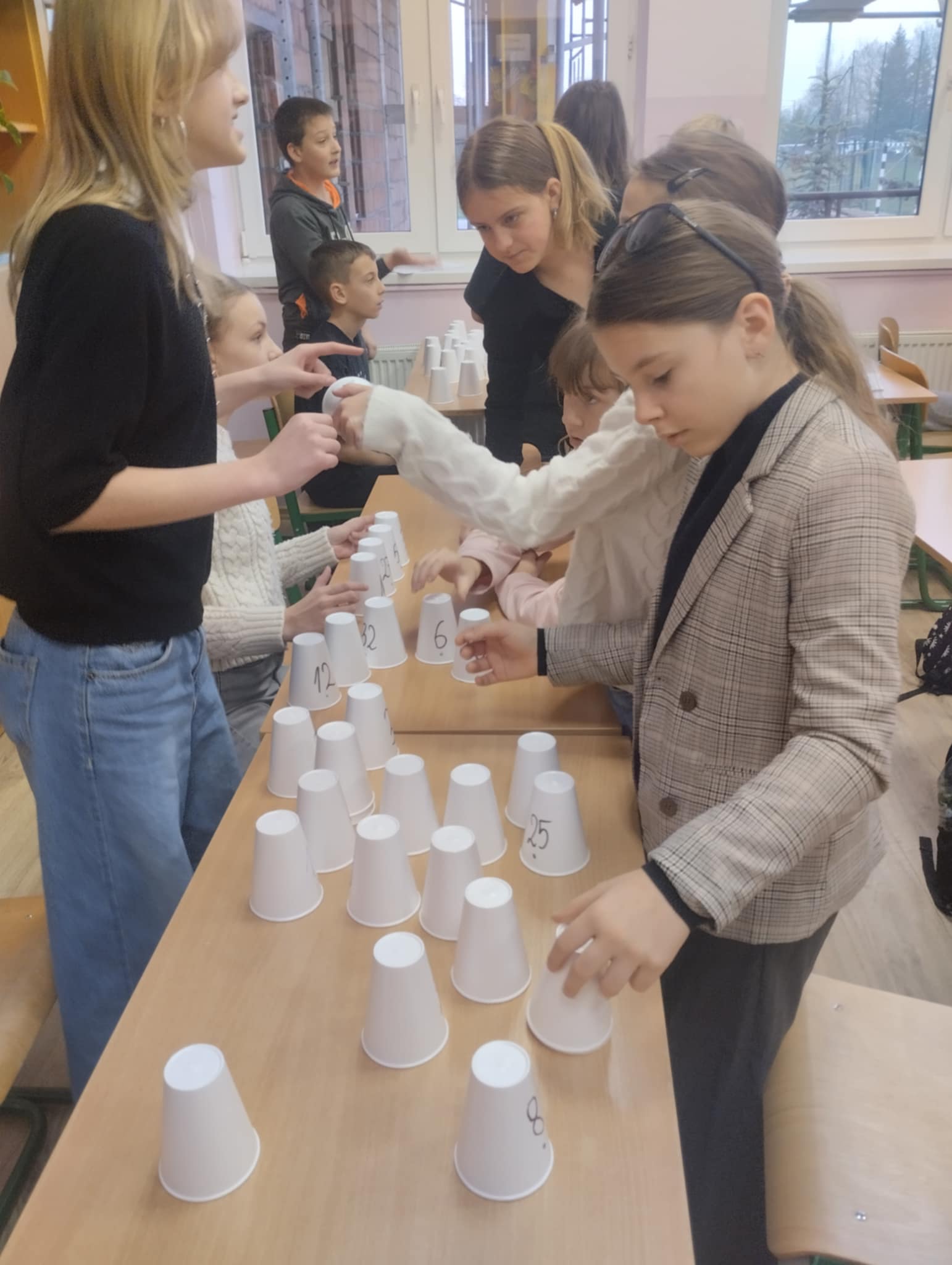 W dniu 21.11.2025 roku świętowaliśmy w naszej szkole Światowy Dzień Tabliczki Mnożenia. Z tej okazji na zajęciach matematyki uczniowie klas 5–8 mierzyli się w pojedynkach tabliczkowego mistrza, brali udział w zabawach drużynowych, a także w quizach wykorzystujących kubeczki oraz klapki na muchy. Na tablicy zawisła plansza z wynikami różnych działań z zakresu mnożenia do 100. Nauczyciel czytał kolejne działania, a zadaniem uczniów było jak najszybsze „klapnięcie” poprawnego wyniku. Zabawa połączona z nauką sprawiła, że nawet trudniejsze działania były wykonywane z uśmiechem i dużym zaangażowaniem.